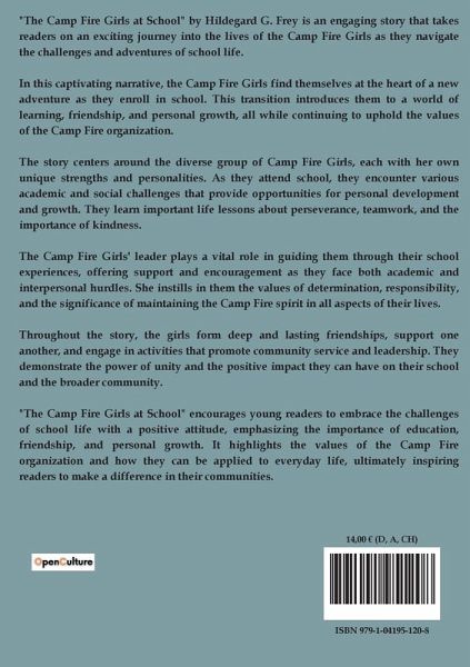 "The Camp Fire Girls at School" by Hildegard G. Frey is an engaging story that takes readers on an exciting journey into the lives of the Camp Fire Girls as they navigate the challenges and adventures of school life. In this captivating narrative, the Camp Fire Girls find themselves at the heart of a new adventure as they enroll in school. This transition introduces them to a world of learning, friendship, and personal growth, all while continuing to uphold the values of the Camp Fire organization. The story centers around the diverse group of Camp Fire Girls, each with her own unique strengths and personalities. As they attend school, they encounter various academic and social challenges that provide opportunities for personal development and growth. They learn important life lessons about perseverance, teamwork, and the importance of kindness. The Camp Fire Girls' leader plays a vital role in guiding them through their school experiences, offering support and encouragement as they face both academic and interpersonal hurdles. She instills in them the values of determination, responsibility, and the significance of maintaining the Camp Fire spirit in all aspects of their lives. Throughout the story, the girls form deep and lasting friendships, support one another, and engage in activities that promote community service and leadership. They demonstrate the power of unity and the positive impact they can have on their school and the broader community. "The Camp Fire Girls at School" encourages young readers to embrace the challenges of school life with a positive attitude, emphasizing the importance of education, friendship, and personal growth. It highlights the values of the Camp Fire organization and how they can be applied to everyday life, ultimately inspiring readers to make a difference in their communities.