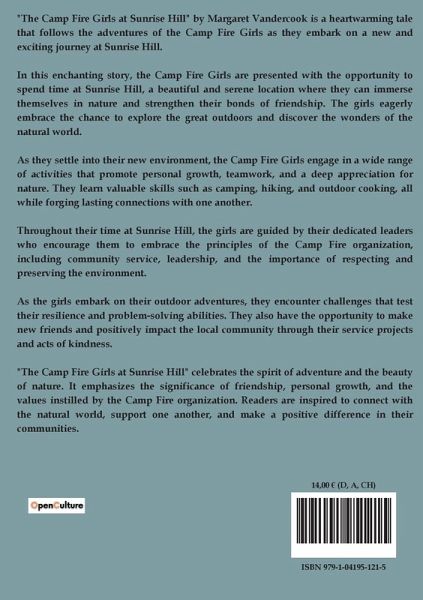 "The Camp Fire Girls at Sunrise Hill" by Margaret Vandercook is a captivating story that explores the lives of young girls seeking adventure, self-discovery, and camaraderie. The narrative begins with Betty Ashton, a young girl who feels discontented with the lack of new experiences for girls. Her life takes a turn when she meets Esther Clark, a girl from an orphan asylum who introduces her to the concept of the Camp Fire Girls. This organization, which emphasizes the values of work, health, and love, offers a new perspective and a sense of purpose. Betty becomes intrigued by the idea of forming a Camp Fire Club with her friends, Polly and Mollie O'Neill. The story delves into the challenges and joys of forming this club, as the girls learn to appreciate each other's strengths and differences. They plan to spend their summer camping, which would allow them to grow closer and learn valuable life skills. The narrative also touches on the personal struggles of the characters, such as Polly's envy of Betty's wealth and the O'Neill family's financial difficulties. Through the Camp Fire Girls, the characters find a way to support each other and create a meaningful community. The book highlights the importance of friendship, self-reliance, and the pursuit of one's passions, making it a timeless tale of empowerment and unity.