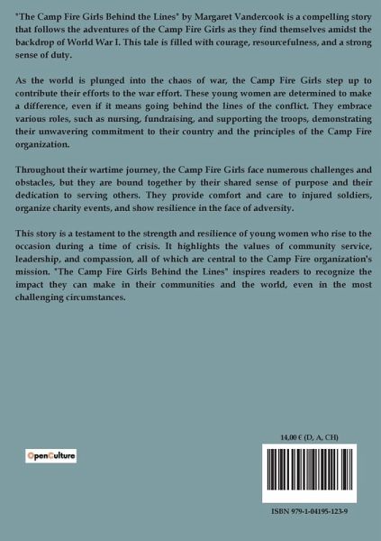 "The Camp Fire Girls Behind the Lines" by Margaret Vandercook is a narrative set against the backdrop of World War I, following a group of Camp Fire girls as they travel down the California coast. The story begins with the girls visiting the old Spanish missions, a journey that serves as a prelude to their summer camp experience. The protagonist, Peggy Webster, along with her friends, is deeply influenced by the romantic and historical atmosphere of the missions. As they settle into their camp near the Pacific Ocean, the girls are inspired to contribute to the war effort by adopting a lifestyle of conservation and service, embodying the principles of the "Camp Fire Minute Girls." The narrative explores the dynamics within the group, particularly focusing on the contrasting personalities of the girls. Gerry Williams, a new member of the group, is portrayed as a character with a mysterious past and a pragmatic outlook on life. Her friendship with Sally Ashton highlights their shared desire for adventure and their differing views on romance and future aspirations. Meanwhile, the presence of Dan and Billy Webster introduces a subplot of sibling rivalry and differing ideologies about the war, with Dan eager to serve and Billy advocating for peace. As the girls navigate their summer, they encounter various challenges and opportunities for growth. The story emphasizes themes of friendship, responsibility, and the impact of the war on personal lives. Through their experiences, the girls learn valuable lessons about self-reliance, community service, and the importance of supporting each other in times of uncertainty.