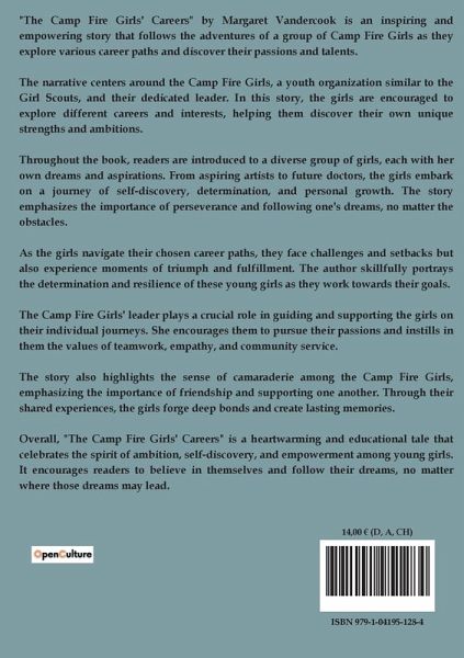 "The Camp Fire Girls' Careers" by Margaret Vandercook is an inspiring and empowering story that follows the adventures of a group of Camp Fire Girls as they explore various career paths and discover their passions and talents. The narrative centers around the Camp Fire Girls, a youth organization similar to the Girl Scouts, and their dedicated leader. In this story, the girls are encouraged to explore different careers and interests, helping them discover their own unique strengths and ambitions. Throughout the book, readers are introduced to a diverse group of girls, each with her own dreams and aspirations. From aspiring artists to future doctors, the girls embark on a journey of self-discovery, determination, and personal growth. The story emphasizes the importance of perseverance and following one's dreams, no matter the obstacles. As the girls navigate their chosen career paths, they face challenges and setbacks but also experience moments of triumph and fulfillment. The author skillfully portrays the determination and resilience of these young girls as they work towards their goals. The Camp Fire Girls' leader plays a crucial role in guiding and supporting the girls on their individual journeys. She encourages them to pursue their passions and instills in them the values of teamwork, empathy, and community service. The story also highlights the sense of camaraderie among the Camp Fire Girls, emphasizing the importance of friendship and supporting one another. Through their shared experiences, the girls forge deep bonds and create lasting memories. Overall, "The Camp Fire Girls' Careers" is a heartwarming and educational tale that celebrates the spirit of ambition, self-discovery, and empowerment among young girls. It encourages readers to believe in themselves and follow their dreams, no matter where those dreams may lead.
