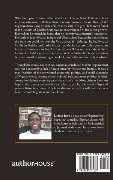 With both parents from Tabo Gido Ora in Ukama State, Badamasi, born in Takula-Kakuri, in Badaka State was commissioned as an officer of the Nigerian Army using his state of birth as his state of origin. He however found that his claim of Badaka State was an encumbrance to his career growth. Everywhere he turned, he found that his identity was constantly questioned. He couldn't identify as an indigene of Ukama State because he neither knew the State nor could he speak the Ora dialect. Yet, although he had lived all his life in Badaka and spoke Hausa fluently, he was not fully accepted or integrated into their society. He figured he will lose out when the military hierarchical ladder gets narrower since at those higher levels, quota system becomes crucial to getting higher ranks. He found he was internally displaced. Through his various experiences, Badamasi concluded that his displacement was not necessarily a lack of acceptance by the society. Instead, it was a manifestation of the convoluted economic, political and social dynamics of Nigeria where, because of past colonial rule and many political failures, corruption defines every aspect of the citizen's life. Most citizens have lost hope in the country and now have a collective psyche of internally displaced persons living in a camp. They hope that someday they will find their way home because Nigeria is not their home.