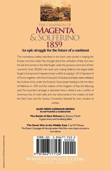 An epic struggle for the future of a continent The momentous battles described in this book were pivotal in shaping the Europe we know today. They brought about the unification of Italy and were the last time armies in the field fought under the personal command of their monarchs. Over 200,000 men took part, making Solferino the largest battle fought in Europe since Napoleon's epic conflict at Leipzig in 1813. Napoleon III of France together with Victor Emanuel II of Sardinia and Italian states defeated the Austrian Army under the Emperor Franz Joseph leading to the Armistice of Villafranca in 1859 and the creation of the Kingdom of Italy the following year. This important campaign is described here in detail. It was a conflict of enormous loss on both sides and was instrumental in the creation of both the Red Cross and the Geneva Convention. Essential for every student of warfare.