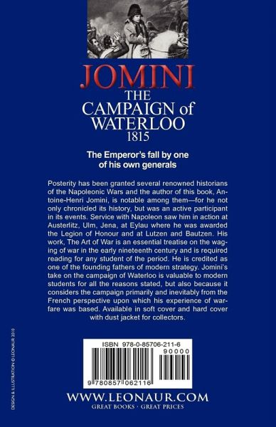 The Emperor's fall by one of his own generals Posterity has been granted several renowned historians of the Napoleonic Wars and the author of this book, Antoine-Henri Jomini, is notable among them-for he not only chronicled its history, but was an active participant in its events. Service with Napoleon saw him in action at Austerlitz, Ulm, Jena, at Eylau where he was awarded the Legion of Honour and at Lutzen and Bautzen. His work, The Art of War is an essential treatise on the waging of war in the early nineteenth century and is required reading for any student of the period. He is credited as one of the founding fathers of modern strategy. Jomini's take on the campaign of Waterloo is valuable to modern students for all the reasons stated, but also because it considers the campaign primarily and inevitably from the French perspective upon which his experience of warfare was based. Available in soft cover and hard cover with dust jacket for collectors.