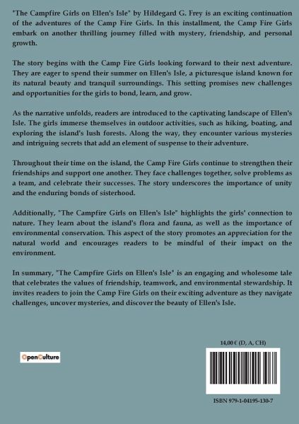 "The Campfire Girls on Ellen's Isle" by Hildegard G. Frey is an exciting continuation of the adventures of the Camp Fire Girls. In this installment, the Camp Fire Girls embark on another thrilling journey filled with mystery, friendship, and personal growth. The story begins with the Camp Fire Girls looking forward to their next adventure. They are eager to spend their summer on Ellen's Isle, a picturesque island known for its natural beauty and tranquil surroundings. This setting promises new challenges and opportunities for the girls to bond, learn, and grow. As the narrative unfolds, readers are introduced to the captivating landscape of Ellen's Isle. The girls immerse themselves in outdoor activities, such as hiking, boating, and exploring the island's lush forests. Along the way, they encounter various mysteries and intriguing secrets that add an element of suspense to their adventure. Throughout their time on the island, the Camp Fire Girls continue to strengthen their friendships and support one another. They face challenges together, solve problems as a team, and celebrate their successes. The story underscores the importance of unity and the enduring bonds of sisterhood. Additionally, "The Campfire Girls on Ellen's Isle" highlights the girls' connection to nature. They learn about the island's flora and fauna, as well as the importance of environmental conservation. This aspect of the story promotes an appreciation for the natural world and encourages readers to be mindful of their impact on the environment. In summary, "The Campfire Girls on Ellen's Isle" is an engaging and wholesome tale that celebrates the values of friendship, teamwork, and environmental stewardship. It invites readers to join the Camp Fire Girls on their exciting adventure as they navigate challenges, uncover mysteries, and discover the beauty of Ellen's Isle.