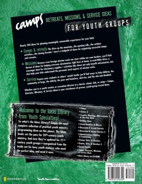 Nearly 200 ideas for planning meaningful, memorable experiences for your kids! -Camps & Retreats . . . The drive up the mountain . . . The opening talk . . . The outdoor activities . . . The closing fireside -- here's a lodgeful of ideas for organizing successful camps and retreats. - Missions . . . Because even foreign mission work can start within our own borders, you'll find dozens of ideas for helping overseas missionaries right here at home. A used-Bible drive, a scavenger hunt for missionary supplies -- activities like these not only benefit missionaries, but also help your kids understand the personal, local aspects of mission work. - Service . . . Expose your students to others' needs! Inside you'll find ways to help children, the community at large, the elderly, the poor and homeless, shut-ins, and the sick and disabled Whether you're a youth worker or recreation director in a church, school, club, or camp -- Camps, Retreats, Missions, & Service Ideas is your storehouse of proven, youth-group tested ideas.