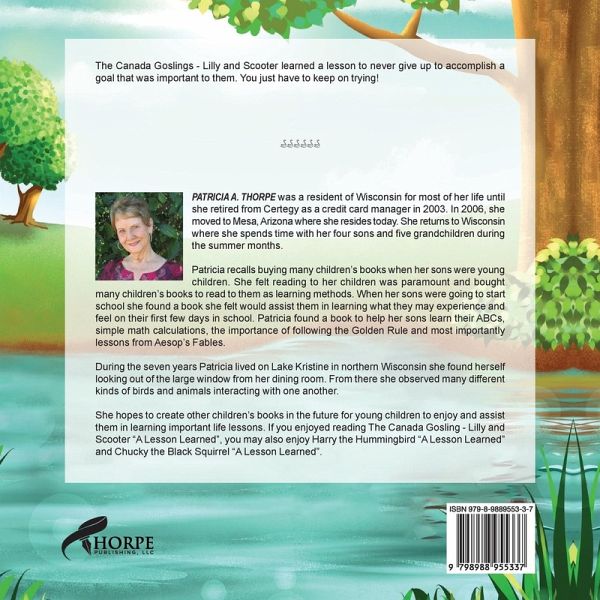 The Canada Goslings - Lilly and Scooter learned a lesson to never give up to accomplish a goal that was important to them. You just have to keep on trying! ¿¿PATRICIA A. THORPE was a resident of Wisconsin for most of her life until she retired from Certegy as a credit card manager in 2003. In 2006, she moved to Mesa, Arizona where she resides today. She returns to Wisconsin where she spends time with her four sons and five grandchildren during the summer months. Patricia recalls buying many children's books when her sons were young children. She felt reading to her children was paramount and…mehr