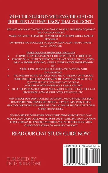 The most up-to-date study guide for students taking the CFAT (Canadian Forces Aptitude Test) with hopes of enlisting in the Canadian Armed Forces. A comprehensive review of the most important concepts, with 180 practise questions and answers.