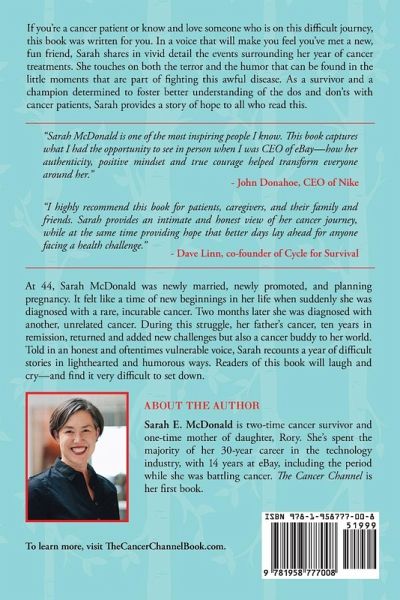 If you're a cancer patient or know and love someone who is on this difficult journey, this book was written for you. In a voice that will make you feel you've met a new, fun friend, Sarah shares in vivid detail the events surrounding her year of cancer treatments. She touches on both the terror and the humor that can be found in the little moments that are part of fighting this awful disease. As a survivor and a champion determined to foster better understanding of the dos and don'ts with cancer patients, Sarah provides a story of hope to all who read this. At 44, Sarah McDonald was newly married, newly promoted, and planning pregnancy. It felt like a time of new beginnings in her life when suddenly she was diagnosed with a rare, incurable cancer. Two months later she was diagnosed with another, unrelated cancer. During this struggle, her father's cancer, ten years in remission, returned and added new challenges but also a cancer buddy to her world. Told in an honest and oftentimes vulnerable voice, Sarah recounts a year of difficult stories in lighthearted and humorous ways. Readers of this book will laugh and cry-and find it very difficult to set down. Sarah E. McDonald is two-time cancer survivor and one-time mother of daughter, Rory. She's spent the majority of her 30-year career in the technology industry, with 14 years at eBay, including the period while she was battling cancer. The Cancer Channel is her first book. To learn more, visit TheCancerChannelBook.com.