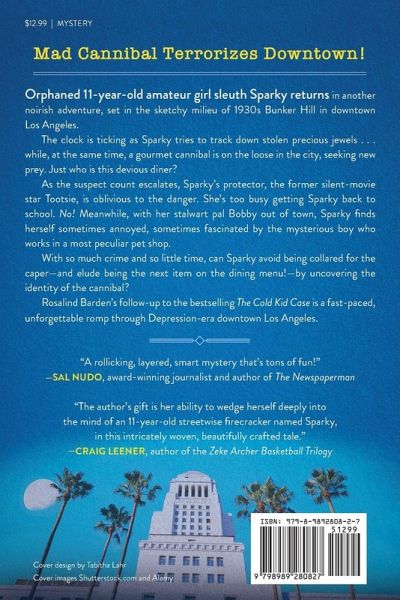 Mad Cannibal Terrorizes Downtown! Orphaned 11-year-old amateur girl sleuth Sparky returns in another noirish adventure, set in the sketchy milieu of 1930s Bunker Hill in downtown Los Angeles. The clock is ticking as Sparky tries to track down stolen precious jewels . . . while, at the same time, a gourmet cannibal is on the loose in the city, seeking new prey. Just who is this devious diner? As the suspect count escalates, Sparky's protector, the former silent-movie star Tootsie, is oblivious to the danger. She's too busy getting Sparky back to school. No! Meanwhile, with her stalwart pal Bobby out of town, Sparky ¿nds herself sometimes annoyed, sometimes fascinated by the mysterious boy who works in a most peculiar pet shop. With so much crime and so little time, can Sparky avoid being collared for the caper-and elude being the next item on the dining menu!-by uncovering the identity of the cannibal? Rosalind Barden's follow-up to bestselling The Cold Kid Case is a fast-paced, unforgettable romp through Depression-era downtown Los Angeles that's a fun cozy historical read for tweens to grownups. Follow more crime-solving misadventures of Sparky, the most unlikely amateur sleuth, with The Monkey Island Murder: A Sparky of Bunker Hill Mystery, The South Seas Shenanigans: A Sparky of Bunker Hill Mystery, and coming in 2025, The Catalina Cahoots: A Sparky of Bunker Hill Mystery. Critters Readers Poll Winner for Best Young Adult Book and Top 10 Finisher for Best Mystery Novel.