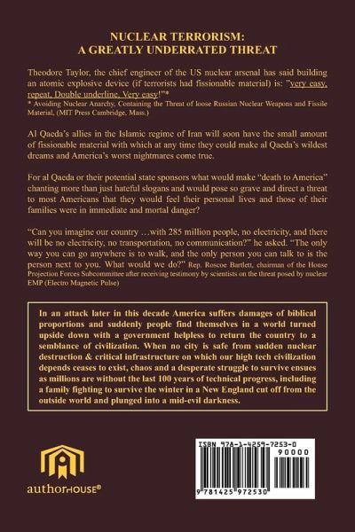 The Cannons of Armageddon is a chilling illustration (64 pages non-fiction, 222 pages fiction) of a very plausable nuclear terrorist attack by al Qaeda and Iran against an America whose populaton and electronic infrastructure is currently so vunerable and unprepared that modern technological civilization is destroyed in most of our country. As was the case in the use of large airplanes loaded with thousands of gallons of aviation fuel as potential WMD prior the 911 attacks, few people realize how easily crude Hiroshima size atomic bombs (uranuim "gun assembly" devices) could be built and what an existential threat to America terrorists represent once they posses weapons grade nuclear material for the small explosive cores these devices. The non-fiction chapters form the scientific, geo-political and theological basis for a frightening plot: In an attack later in this decade America suffers damages of biblical proportions and suddenly people find themselves in a world turned upside down with a government helpless to return the country to a semblance of civilization. When no city is safe from sudden nuclear destruction & critical infrastructure on which our high tech civilization depends ceases to exist, chaos and a desperate struggle to survive ensues as millions are without the last 100 years of technical progress, including a family fighting to survive the winter in a New England cut off from the outside world and plunged into a mid-evil darkness.