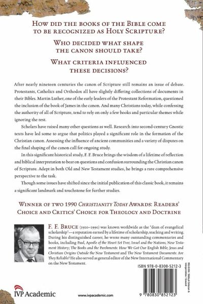 How did the books of the Bible come to be recognized as Holy Scripture? After nearly nineteen centuries the canon of Scripture remains an issue of debate. Adept in both Old and New Testament studies, F. F. Bruce brings the wisdom of a lifetime of reflection and biblical interpretation to bear in addressing the criteria of canonicity, the canon within the canon, and canonical criticism.