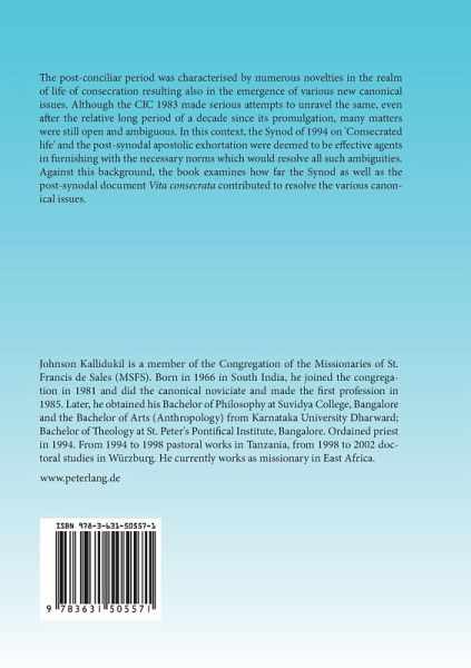 The post-conciliar period was characterised by numerous novelties in the realm of life of consecration resulting also in the emergence of various new canonical issues. Although the CIC 1983 made serious attempts to unravel the same, even after the relative long period of a decade since its promulgation, many matters were still open and ambiguous. In this context, the Synod of 1994 on 'Consecrated life' and the post-synodal apostolic exhortation were deemed to be effective agents in furnishing with the necessary norms which would resolve all such ambiguities. Against this background, the book examines how far the Synod as well as the post-synodal document Vita consecrata contributed to resolve the various canonical issues.