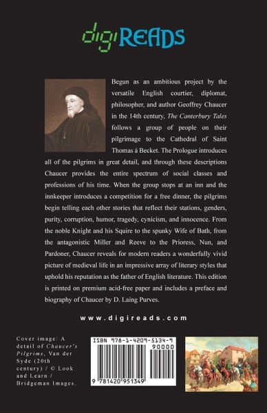 Begun as an ambitious project by the versatile English courtier, diplomat, philosopher, and author Geoffrey Chaucer in the 14th century, "The Canterbury Tales" follows a group of people on their pilgrimage to the Cathedral of Saint Thomas á Becket. The Prologue introduces all of the pilgrims in great detail, and through these descriptions Chaucer provides the entire spectrum of social classes and professions of his time. When the group stops at an inn and the innkeeper introduces a competition for a free dinner, the pilgrims begin telling each other stories that reflect their stations, genders, purity, corruption, humor, tragedy, cynicism, and innocence. From the noble Knight and his Squire to the spunky Wife of Bath, from the antagonistic Miller and Reeve to the Prioress, Nun, and Pardoner, Chaucer reveals for modern readers a wonderfully vivid picture of medieval life in an impressive array of literary styles that uphold his reputation as the father of English literature. This edition is printed on premium acid-free paper and includes a preface and biography of Chaucer by D. Laing Purves.