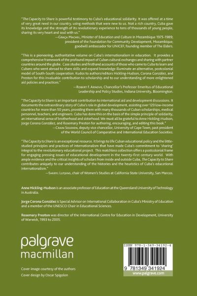 'The Capacity to Share is a deeply important contribution to the international aid and development discussion. It documents the extraordinary story of Cuba's role in global development, assisting over 120 other low-income countries by providing them during the past 50 years with many thousands of Cuban scholarships, medical personnel, teachers and engineers. Cuba has done this on the basis of the simple principle of solidarity an international sense of brotherhood and sisterhood. This demonstrates to the world a way of being that does not need to be activated by 'winning', by patronizing charity, by being 'on top'. All that counts is our common humanity. We must all be grateful to Anne Hickling-Hudson, Jorge Corona Gonzalez, and Rosemary Preston for authoring, encouraging, and editing this book.' - Crain Soudien, Deputy Vice Chancellor, University of Cape Town; Past President of the World Council of Comparative and International Education Societies (WCCES)