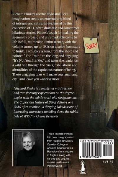 Richard Plinke's acerbic style and lucid imagination create an entertaining blend of intrigue and satire, as evidenced by this collection of 11, often dramatic and sometimes hilarious stories. Plinke's touch for making the seemingly prosaic and unremarkable come to life in full, multicolor luminescence, with the volume turned up to 10, is on display from start to finish. Each story a gem, from the short and pointed "The Train," to the long and engaging "It's Not You, It's Me," and takes the reader on a wild ride through the trials, tribulations and absurdities of the capricious nature of being. These engaging tales will make you laugh and cry...and leave you wanting more.