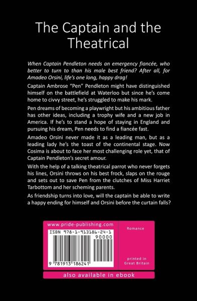 When Captain Pendleton needs an emergency fiancée, who better to turn to than his male best friend? After all, for Amadeo Orsini, life's one long, happy drag! Captain Ambrose "Pen" Pendleton might have distinguished himself on the battlefield at Waterloo but since he's come home to civvy street, he's struggled to make his mark. Pen dreams of becoming a playwright but his ambitious father has other ideas, including a trophy wife and a new job in America. If he's to stand a hope of staying in England and pursuing his dream, Pen needs to find a fiancée fast. Amadeo Orsini never made it as a leading man, but as a leading lady he's the toast of the continental stage. Now Cosima is about to face her most challenging role yet, that of Captain Pendleton's secret amour. With the help of a talking theatrical parrot who never forgets his lines, Orsini throws on his best frock, slaps on the rouge and sets out to save Pen from the clutches of Miss Harriet Tarbottom and her scheming parents. As friendship turns into love, will the captain be able to write a happy ending for himself and Orsini before the curtain falls?