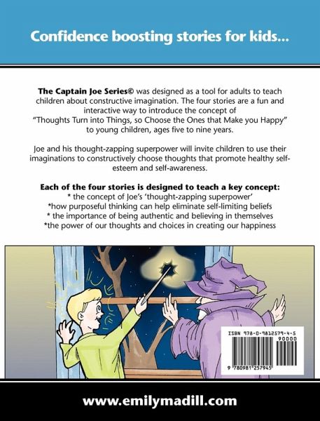 The Captain Joe Series© was designed as a tool for adults to teach children about constructive imagination. The four stories are a fun and interactive way to introduce the concept of "Thoughts Turn into Things, so Choose the Ones that Make you Happy" to young children, ages five to nine years. Joe and his thought-zapping superpower will invite children to use their imaginations to constructively choose thoughts that promote healthy self-esteem and self-awareness. Each of the four stories is designed to teach a key concept. This 108 page full color collection includes the complete text of all 4 books in the series. Captain Joe to the Rescue is the first book in the series and introduces Joe and the concept of his 'thought-zapping superpower'. Children will be captivated by Joe and his encounter with Wilfred the friendly wizard. Wilfred presents Joe with a special wand that helps him take charge of his thoughts by ZAPPING away his unhappy thoughts and replacing them with ones that are happy. This introductory book is a great way to begin discussions with children around thoughts, attitudes and personal power in shaping them. Captain Joe Saves the Day is the second book in the series and is a lesson in how purposeful thinking can help eliminate self-limiting beliefs. Children will discover what happens when Joe uses his invisible 'thought-zapping' wand to save himself from his swampy pit thoughts. After giving in to his self-doubt and disappointment, Joe learns the importance of speaking up and taking an active role in reaching his dreams of becoming a soccer goalie. Most everyone can recall a time in their lives where they held themselves back from what they really wanted because they were afraid they wouldn't measure up; this story is a great way to open discussions around this valuable life lesson in a basic and appealing way kids will relate to. Captain Joe's Gift is the third book in the series and teaches children about the importance of being authentic and believing in themselves. Children will discover what happens when Joe uses his 'thought zapping superpower' to reveal his special gift. Readers are encouraged to recognize and embrace their own unique traits. This story will leave children feeling confident and proud to share their own special gifts and abilities with the world. It's a great way to introduce discussions with children around anti-bullying and celebrating our differences. Captain Joe's Choice is the fourth book in the series and teaches children that when we choose happy thoughts that feel good, we set ourselves up to attract more happy thoughts and positive outcomes into our lives. Readers will witness Joe's starring role on the big screen and how his thoughts and choices influence the different outcomes. Joe uses his 'thought zapping superpower' to help him reach the end result he wants. This story is a great introduction to discussions around the power of our thoughts and choices in creating our happiness.