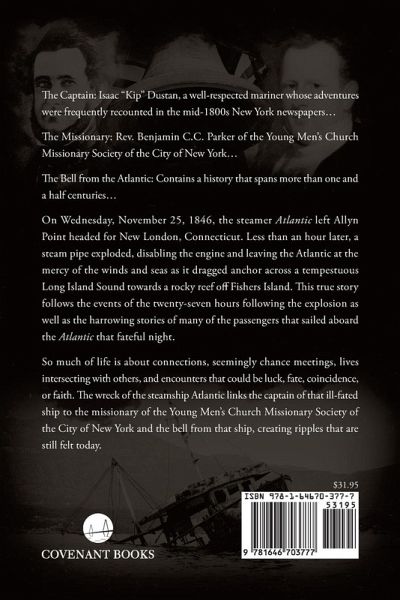 The Captain: Isaac "Kip" Dustan, a well-respected mariner whose adventures were frequently recounted in the mid-1800s New York newspapers… The Missionary: Rev. Benjamin C.C. Parker of the Young Men's Church Missionary Society of the City of New York… The Bell from the Atlantic: Contains a history that spans more than one and a half centuries… On Wednesday, November 25, 1846, the steamer Atlantic left Allyn Point headed for New London, Connecticut. Less than an hour later, a steam pipe exploded, disabling the engine and leaving the Atlantic at the mercy of the winds and seas as it dragged anchor across a tempestuous Long Island Sound towards a rocky reef off Fishers Island. This true story follows the events of the twenty-seven hours following the explosion as well as the harrowing stories of many of the passengers that sailed aboard the Atlantic that fateful night. So much of life is about connections, seemingly chance meetings, lives intersecting with others, and encounters that could be luck, fate, coincidence, or faith. The wreck of the steamship Atlantic links the captain of that ill-fated ship to the missionary of the Young Men's Church Missionary Society of the City of New York and the bell from that ship, creating ripples that are still felt today.