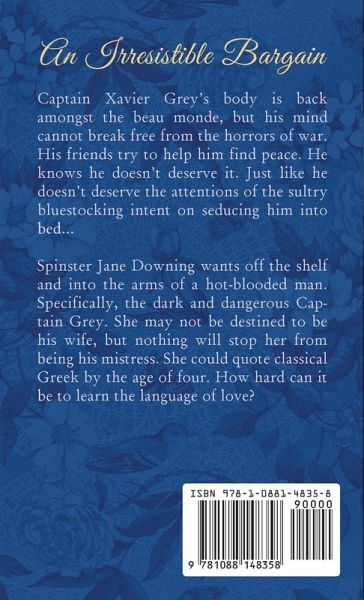 A pining-for-you, military hero, snowbound together romance from a New York Times bestselling author: Captain Xavier Grey's body is back amongst the beau monde, but his mind cannot break free from the horrors of war. His friends try to help him find peace. He knows he doesn't deserve it. Just like he doesn't deserve the attentions of the sultry bluestocking intent on seducing him into bed... Spinster Jane Downing wants off the shelf and into the arms of a hot-blooded man. Specifically, the dark and dangerous Captain Grey. She may not be destined to be his wife, but nothing will stop her from being his mistress. She could quote classical Greek by the age of four. How hard can it be to learn the language of love? The fan-favorite Dukes of War series features roguish peers and dashing war heroes who return from battle only to be thrust into the splendor and madness of Regency England.