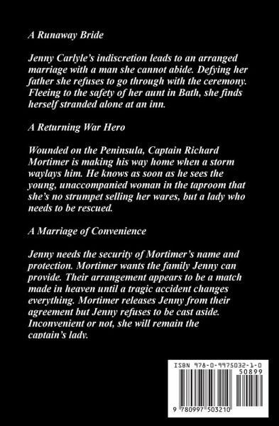 A Runaway Bride Jenny Carlyle's indiscretion led to an arranged marriage with a man she cannot abide. Defying her father she refuses to go through with the ceremony. Fleeing to the safety of her aunt in Bath, she finds herself stranded alone at an inn. A Returning War Hero Wounded on the Peninsula, Captain Richard Mortimer is making his way home when a storm waylays him. He knows as soon as he sees the young, unaccompanied woman in the taproom that she's no strumpet selling her wares, but a lady who needs to be rescued. A Marriage of Convenience Jenny needs the security of Mortimer's name and protection. Mortimer wants the family Jenny can provide. Their arrangement appears to be a match made in heaven until a tragic accident changes everything. Mortimer releases Jenny from their agreement but Jenny refuses to be cast aside. Inconvenient or not, she will remain the captain's lady.