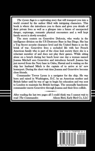 The Lyons Saga is a captivating story that will transport you into a world created by the author filled with intriguing characters. This book is where she introduces you to them and gives you details of their private lives as well as a glimpse into a future of unexpected danger, espionage, romantic physical encounters and a well kept family secret is slowly revealed. The story centers on Genevieve Delcroix, who works in the intelligence division on the US Destroyer Base in San Diego. She has a Top Secret security clearance level and the United States is on the brink of war. Genevieve lives a secluded life with her French American family who is part of the close knit society there she is a reluctant member of and does not play their games. While sitting alone on a bench during her lunch hour one day a woman named Joanna Mitchell sees Genevieve and introduces herself. Joanna has just moved from the Navy base in Oahu, Hawaii and is waiting on the ship her husband Mitch is the captain of to arrive at its' new homeport. During the short wait time Joanna and Genevieve become close friends. Commander Trevor Lyons is a navigator for the ship. He was born and raised in Washington, D.C. by an American mother and British father until he was of age to begin his education and was sent to London to maintain his British heritage. Instead of attending a university there he chose to attend the United States Naval Academy due to his love of the sea that developed on his numerous trips aboard ocean liners to spend summers at home. The unusually handsome commander meets Genevieve through Joanna and their lives collide.