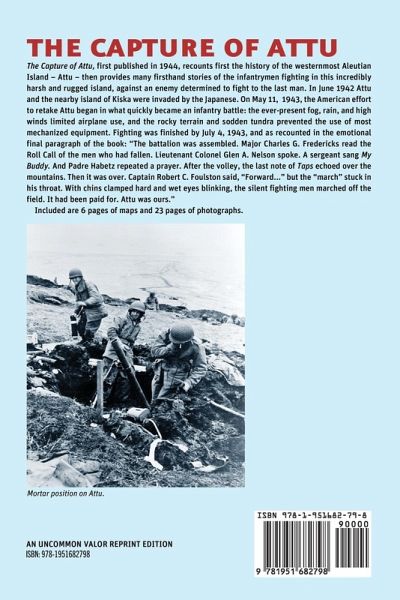 The Capture of Attu, first published in 1944, recounts first the history of the westernmost Aleutian Island - Attu - then provides many firsthand stories of the infantrymen fighting in this incredibly harsh and rugged island, against an enemy determined to fight to the last man. In June 1942 Attu and the nearby island of Kiska were invaded by the Japanese. On May 11, 1943, the American effort to retake Attu began in what quickly became an infantry battle: the ever-present fog, rain, and high winds limited airplane use, and the rocky terrain and sodden tundra prevented the use of most mechanized equipment. Fighting was finished by July 4, 1943, and as recounted in the emotional final paragraph of the book: "The battalion was assembled. Major Charles G. Fredericks read the Roll Call of the men who had fallen. Lieutenant Colonel Glen A. Nelson spoke. A sergeant sang My Buddy. And Padre Habetz repeated a prayer. After the volley, the last note of Taps echoed over the mountains. Then it was over. Captain Robert C. Foulston said, "Forward..." but the "march" stuck in his throat. With chins clamped hard and wet eyes blinking, the silent fighting men marched off the field. It had been paid for. Attu was ours." Included are 6 pages of maps and 23 pages of photographs.