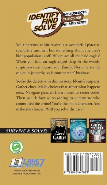 Identify suspects, gather clues, navigate puzzles, and solve the mystery in this interactive Choose Your Path thriller. Your parents' cabin resort is a wonderful place to spend the summer and a great opportunity to make some extra money. You work hard: cleaning rooms, running errands, and entertaining guests. But you also play hard: swimming, fishing, hiking, and birdwatching. Something about the area's bird population is off, though. Most notably, you haven't seen any bald eagles. When one of these majestic raptors is found caged in the woods, suspicions turn toward you family. Not only are the bald eagles in jeopardy, so is your mom and dad's business. You're the detective in this puzzling mystery by acclaimed author Deb Mercier. As you work your way through the story, it's up to you to identify suspects and gather clues, make choices that affect what happens, navigate challenging puzzles-from riddles to secret codes?and use deductive reasoning to determine what the crime was, how it happened, and whodunit. Interactive books for kids are more popular than ever. Create your own adventure with the Detective: You book series for boys and girls. You're the main character. You make the choices. Will you solve the case?
