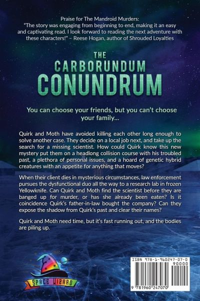 You can choose your friends, but you can't choose your family... Quirk and Moth have avoided killing each other long enough to solve another case. They decide on a local job next, and take up the search for a missing scientist. How could Quirk know this new mystery put them on a headlong collision course with his troubled past, a plethora of personal issues, and a hoard of genetic hybrid creatures with an appetite for anything that moves? When their client dies in mysterious circumstances, law enforcement pursues the dysfunctional duo all the way to a research lab in frozen Yellowknife. Can Quirk and Moth find the scientist before they are banged up for murder, or has she already been eaten? Is it coincidence Quirk's father-in-law bought the company? Can they expose the shadow from Quirk's past and clear their names? Quirk and Moth need time, but it's fast running out, and the bodies are piling up. Find out what happens in The Carborundum Conundrum!
