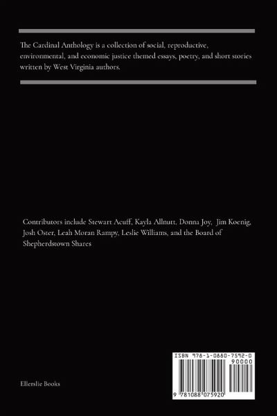 The Cardinal Anthology is a collection of social, reproductive, environmental, and economic justice themed essays, poetry, and short stories written by West Virginia authors. Contributors include Stewart Acuff, Kayla Daniels, Donna Joy, Jim Koenig, Leah Moran Rampy, Josh Oster, and Leslie Williams.