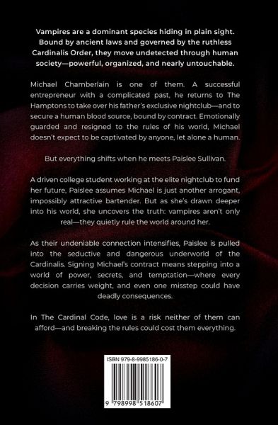 The Cardinal Code is a darkly seductive vampire romance perfect for fans of forbidden love, elite power struggles, and secret societies. Vampires are real. Powerful, ancient, and nearly untouchable, they rule from the shadows under the iron grip of the Cardinal Order-a global authority that enforces secrecy and punishes betrayal. Michael Chamberlain is one of them. A cold and calculating vampire heir with a buried past, he returns to the Hamptons to manage his family's exclusive nightclub and secure a legal blood contract. But when he meets Paislee Sullivan-a struggling college student with no idea vampires exist-his carefully ordered life begins to unravel. Paislee is just looking for a job to stay afloat. She never expected to be drawn into a hidden world of blood rites, supernatural politics, and deadly consequences. The deeper she's pulled in, the harder it becomes to resist Michael. And the truth he's hiding. In a society where consent is signed in blood, and desire is dangerous, defiance could cost them everything. The Cardinal Code blends steamy romance, and vampire intrigue. In a high-stakes world where the rich are not human, the rules are absolute, love might just rewrite the code.
