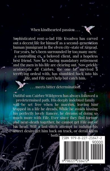 When kindhearted passion . . . Sophisticated rent-a-lad Fife Kwadwo has carved out a decent life for himself as a second-generation human immigrant in the elven city-state of Airgead. For years, he's been surrounded by too many men: a controlling ex, a beloved client, and a hopeless best friend. As he faces mandatory retirement, the men in his life are clearing out. Now prickly aristocratic elf Cairbre, the one he survived a terrifying ordeal with, has stumbled back into his life, and Fife can't help but catch him. . . . meets bitter determination. Dutiful son Cairbre Wildgreen has always followed a predetermined path. His deeply indebted family will be set free when he marries, leaving him trapped in a life he dreads. While he avoids kissing his perfectly lovely fiancée, he dreams of doing so much more with Fife. Ever since they fled torture and near-death together, he cannot get Fife out of his head. Will a last-ditch attempt to indulge his secret desire get him back on track, or derail them both? Return to Airgead, the city of magic and technology, aristocrats and working class, elves and humans, as Fife and Cairbre deal with the aftermath of the events set in motion in The Calm Before. Content warning: This book deals with themes of trauma and grief. 78,000 words.