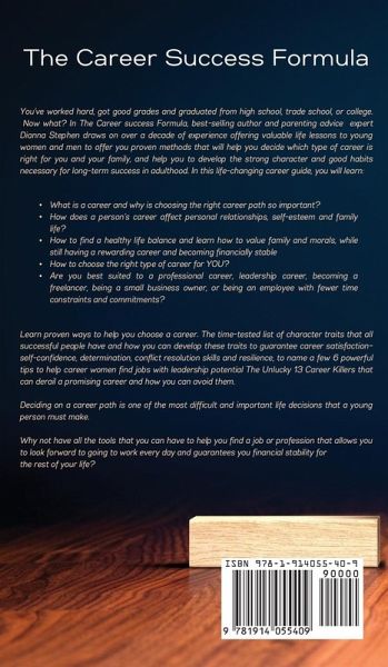 You've worked hard, got good grades and graduated from high school, trade school, or college. Now what? In The Career Success Formula, best-selling author and parenting advice expert Bukky Ekine-Ogunlana draws on over a decade of experience offering valuable life lessons to young women and men to offer you proven methods that will help you decide which type of career is right for you and your family, and help you to develop the strong character and good habits necessary for long-term success in adulthood. In this life-changing career guide, you will learn:What is a career and why is choosing the right career path so important? How does a person's career affect personal relationships, self-esteem and family life? How to find a healthy life balance and learn how to value family and morals, while still having a rewarding career and becoming financially stable How to choose the right type of career for YOU. Are you best suited to a professional career, leadership career, becoming a freelancer, being a small business owner, or being an employee with fewer time constraints and commitments? Learn proven ways to help you choose a career. The time-tested list of character traits that all successful people have and how you can develop these traits to guarantee career satisfaction- self-confidence, determination, conflict resolution skills and resilience, to name a few 6 powerful tips to help career women find jobs with leadership potential The Unlucky 13 Career Killers that can derail a promising career and how you can avoid them. Deciding on a career path is one of the most difficult and important life decisions that a young person must make. Why not have all the tools that you can have to help you find a job or profession that allows you to look forward to going to work every day and guarantees you financial stability for the rest of your life? Page Up and Order Now.