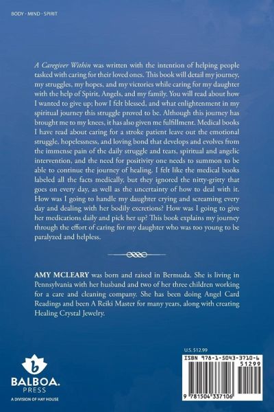 A Caregiver Within was written with the intention of helping people tasked with caring for their loved ones. This book will detail my journey, my struggles, my hopes, and my victories while caring for my daughter with the help of Spirit, Angels, and my family. You will read about how I wanted to give up; how I felt blessed, and what enlightenment in my spiritual journey this struggle proved to be. Although this journey has brought me to my knees, it has also given me fulfillment. Medical books I have read about caring for a stroke patient leave out the emotional struggle, hopelessness, and loving bond that develops and evolves from the immense pain of the daily struggle and tears, spiritual and angelic intervention, and the need for positivity one needs to summon to be able to continue the journey of healing. I felt like the medical books labeled all the facts medically, but they ignored the nitty-gritty that goes on every day, as well as the uncertainty of how to deal with it. How was I going to handle my daughter crying and screaming every day and dealing with her bodily excretions? How was I going to give her medications daily and pick her up? This book explains my journey through the effort of caring for my daughter who was too young to be paralyzed and helpless.