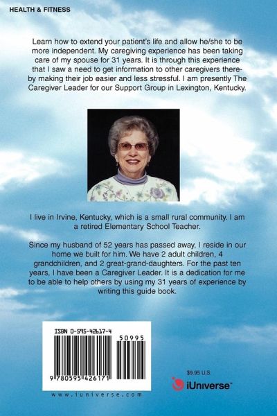 Learn how to extend your patient's life and allow he/she to be more independent. My caregiving experience has been taking care of my spouse for 31 years. It is through this experience that I saw a need to get information to other caregivers there- by making their job easier and less stressful. I am presently The Caregiver Leader for our Support Group in Lexington, Kentucky.
