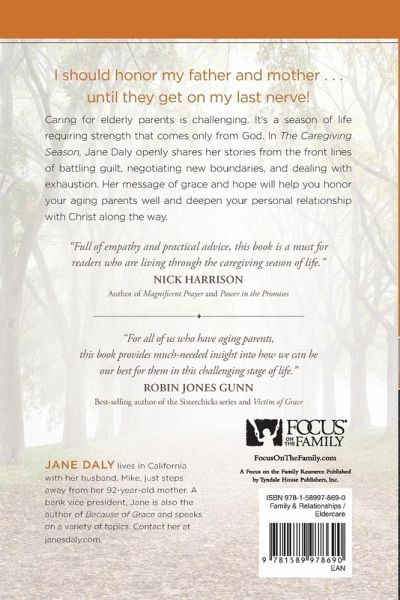 Caring for elderly parents is challenging. It¿s a season of life that requires grace and strength that can only come from God. In The Caregiving Season, Jane Daly shares personal caregiving stories, offering practical advice to help you honor your aging parents well and deepen your personal relationship with Christ along the journey.