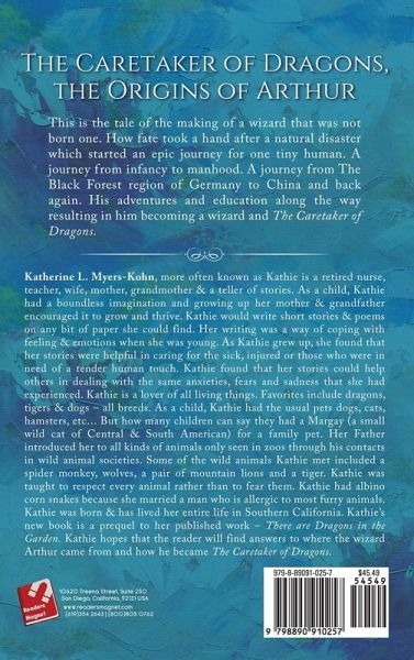 Katherine L. Myers-Kohn, more often known as Kathie is a retired nurse, teacher, wife, mother, grandmother & a teller of stories. As a child, Kathie had a boundless imagination and growing up her mother & grandfather encouraged it to grow and thrive. Kathie would write short stories & poems on any bit of paper she could find. Her writing was a way of coping with feeling & emotions when she was young. As Kathie grew up, she found that her stories were helpful in caring for the sick, injured or those who were in need of a tender human touch. Kathie found that her stories could help others in dealing with the same anxieties, fears and sadness that she had experienced. Kathie is a lover of all living things. Favorites include dragons, tigers & dogs - all breeds. As a child, Kathie had the usual pets dogs, cats, hamsters, etc... But how many children can say they had a Margay (a small wild cat of Central & South American) for a family pet. Her Father introduced her to all kinds of animals only seen in zoos through his contacts in wild animal societies. Some of the wild animals Kathie met included a spider monkey, wolves, a pair of mountain lions and a tiger. Kathie was taught to respect every animal rather than to fear them. Kathie had albino corn snakes because she married a man who is allergic to most furry animals. Kathie was born & has lived her entire life in Southern California. Kathie's new book is a prequel to her published work ¿ There are Dragons in the Garden. Kathie hopes that the reader will find answers to where the wizard Arthur came from and how he became The Caretaker of Dragons.