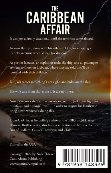 It was just a family vacation... until the terrorists came aboard. Jackson Barr, Jr., along with his wife and kids, are enjoying a Caribbean cruise when all hell breaks loose. At port in Jamaica, an explosion rocks the ship, and all passengers are sent to shore on lifeboats, where they are told they'll be reunited with their children. But Jack senses something's not right, and hides on the ship. His wife calls from shore: the kids are not there. Now alone on a ship with terrorists in control, Jack must fight for his life - and his kids' lives - in order to reunite his family and bring down whoever's doing this. From USA Today bestselling author of the million-sold Harvey Bennett Thrillers series, this fast-paced action thriller is perfect for fans of Ludlum, Cussler, Patterson, and Child.