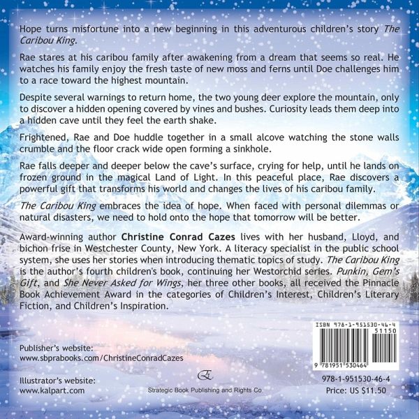 Hope turns misfortune into a new beginning in this adventurous children's story The Caribou King. Rae stares at his caribou family after awakening from a dream that seems so real. He watches his family enjoy the fresh taste of new moss and ferns until Doe challenges him to a race toward the highest mountain. Despite several warnings to return home, the two young deer explore the mountain, only to discover a hidden opening covered by vines and bushes. Curiosity leads them deep into a hidden cave until they feel the earth shake. Frightened, Rae and Doe huddle together in a small alcove watching the stone walls crumble and the floor crack wide open forming a sinkhole. Rae falls deeper and deeper below the cave's surface, crying for help, until he lands on frozen ground in the magical Land of Light. In this peaceful place, Rae discovers a powerful gift that transforms his world and changes the lives of his caribou family. The Caribou King embraces the idea of hope. When faced with personal dilemmas or natural disasters, we need to hold onto the hope that tomorrow will be better. Author Bio: Award-winning author Christine Conrad Cazes lives with her husband, Lloyd, and bichon frise in Westchester County, New York. A literacy specialist in the public school system, she uses her stories when introducing thematic topics of study. The Caribou King is the author's fourth children's book, continuing her Westorchid series. Punkin, Gem's Gift, and She Never Asked for Wings, her three other books, all received the Pinnacle Book Achievement Award in the categories of Children's Interest, Children's Literary Fiction, and Children's Inspiration.