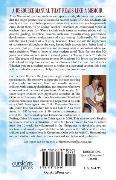 A teacher's manual that reads like a memoir.This is how Mr. Jones describes his new book "The Caring Teacher: Using compassion to connect with kids." After teaching children with special needs for nearly 30 years, Mr. Jones has concluded that the single greatest quality a successful and effective teacher needs is "CARE!" Students will simply not give you their best efforts if they believe their teacher does not GENUINELY CARE about them. This may be one of the most comprehensive books ever written for teachers about how to incorporate CARE in classrooms. Mr. Jones has thoroughly examined virtually every aspect of CARE relative to education. In Parts I and II, Mr. Jones discusses 26 relevant and critical topics all teachers confront every day in the classroom. The reader will have over 30 handouts that Mr. Jones has created over his 30 year career for all teachers to start using so that CARE is being immersed in their classroom. In Part I, Mr. Jones looks at such issues as HOMEWORK, REWARDS, GRADING, DISCIPLINE and STATE EXAMS. In Part II, he examines TEACHING KIDS TO CARE, BEING EVALUATED (BY YOUR STUDENTS), MAINSTREAMING, INCLUSION, how PROFESSIONAL DEVELOPMENT should be utilized, the importance of PARENTAL INVOLVEMENT, why PARENT CONFERENCES HAS NOTHING TO DO WITH PARENTAL INVOLVEMENT and finally, a test teachers can take to see if they are a "PROFESSIONAL TEACHER." In Part III, Mr. Jones explores the "Ten Qualities" of a "Caring Teacher." Examples include "TREATING STUDENTS 'FAIR' NOT THE SAME (WHEN IT COMES TO DISCIPLINE), the importance of CONSISTENCY THROUGHOUT THE YEAR, BEING KIND TO EVERYONE (NOT JUST TO YOUR STUDENTS), having HIGH EXPECTATIONS FOR THEMSELVES (AS WELL AS THEIR STUDENTS) and realizing that CARE AND COMPASSION ARE THE TWO GREATEST QUALITIES NECESSARY TO CONNECT WITH KIDS. The "Caring Teacher" concludes with an Appendix containing seven important addendums including Mr. Jones' "30 Acts of Kindness," a test and scoring rubric to determine if you are a "Caring Teacher" as well as a test and a scoring rubric to see if your students CARE (about their education). Next, is a list of ten movies about "Caring Teachers." This is followed by the "Six Great Books" that show students of all ages the power and importance of compassion. The sixth supplement is the "Four Great Speeches" which Mr. Jones has his students memorize throughout the year to assess if his students CARE (about their education). It is so fitting and appropriate that the seventh and final document is an actual student's assignment which clearly "proves" that teachers do make a difference, although they may not know it at the time. What makes the "Caring Teacher" so enjoyable to read is how Mr. Jones weaves personal stories from both his students and his own life. Additionally, Mr. Jones references historical fictional characters including Jean Valjean ( Les Miserables) and Atticus Finch (To Kill A Mockingbird), as well as current political figures such as Donald Rumsfeld (former Secretary of Defense) and four former Presidents. Other "newsmakers" include Ron Clark (Teacher of the Year, 2000) Anderson Cooper of CNN and even Late Night Comedian, Jimmy Kimmel.