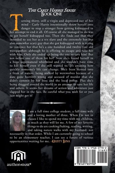 Turning thirty, still a virgin and depressed out of her mind - Carly Harris intentionally threw herself into danger to stop a stranger from getting kidnapped in her attempt to end it all. Of course, all she managed to do was to get herself kidnapped too. Then, she finds out that they intended to use her as a sex slave and the extremely hot but also somewhat scary guy that she got kidnapped with is trying to convince her that he's a one hundred and twelve year old werepanther; although he is offering to escape and take her with him. Only she ended up being the one to save him! Although not before one of them bit her! Now she's found herself in a huge supernatural whirlwind and she wouldn't have time to kill herself even if she still wanted to. It's amazing how quickly someone's life can change. She's been turned into a freak of nature, being stalked by werewolves because of a date gone horribly wrong and accused of murder that she didn't commit by her boss and the local police. Plus, she's being dragged around the world in an attempt to save her life and others. It seems her dreams of action and adventure just slapped her in the face. Be careful what you wish for or you just might get it!