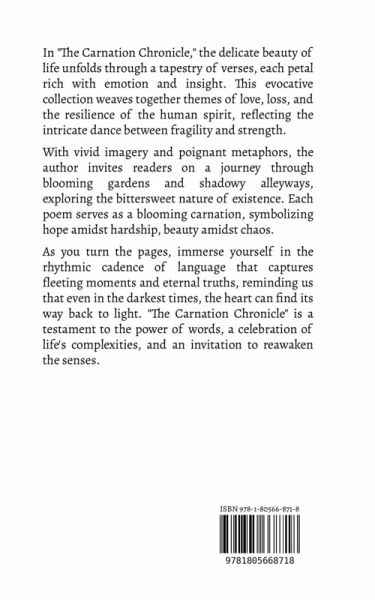 In "The Carnation Chronicle," the delicate beauty of life unfolds through a tapestry of verses, each petal rich with emotion and insight. This evocative collection weaves together themes of love, loss, and the resilience of the human spirit, reflecting the intricate dance between fragility and strength. With vivid imagery and poignant metaphors, the author invites readers on a journey through blooming gardens and shadowy alleyways, exploring the bittersweet nature of existence. Each poem serves as a blooming carnation, symbolizing hope amidst hardship, beauty amidst chaos. As you turn the pages, immerse yourself in the rhythmic cadence of language that captures fleeting moments and eternal truths, reminding us that even in the darkest times, the heart can find its way back to light. "The Carnation Chronicle" is a testament to the power of words, a celebration of life's complexities, and an invitation to reawaken the senses.