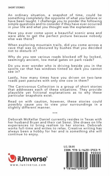 An ordinary situation, a snapshot of time, could be something completely the opposite of what you believe or have been taught. I challenge you to ponder the following simple questions and to consider if they have ever occurred in your life and what you thought was the explanation: Have you ever come upon a beautiful scenic area and were able to get the perfect picture because nobody else was there? When exploring mountain trails, did you come across a cave that was so obscured by bushes that you decided not to disturb it? Why do you see various roads blocked off by locked, seemingly ancient, low metal gates on park roads? Do you ever wonder who is driving beside you in the sports car that has windows tinted so dark you cannot see in? Lastly, how many times have you driven on two-lane roads past pastures with only one cow in them? The Carnivorous Collection is a group of short stories that addresses each of these situations. They provide plausible yet fictional explanations as to why these particular snapshots exist. Read on with caution, however, these stories could possibly cause you to view your surroundings in a slightly different manner.