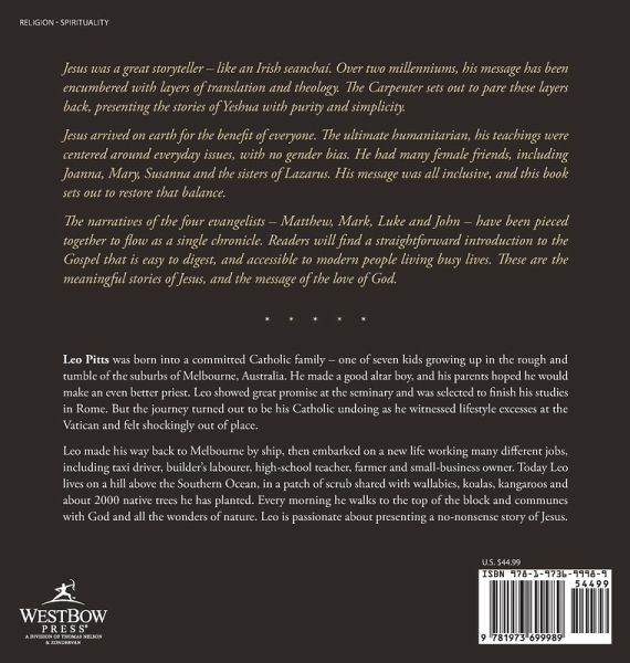 Jesus was a great storyteller - like an Irish seanchaí. Over two millenniums, his message has been encumbered with layers of translation and theology. The Carpenter sets out to pare these layers back, presenting the stories of Yeshua with purity and simplicity. Jesus arrived on earth for the benefit of everyone. The ultimate humanitarian, his teachings were centered around everyday issues, with no gender bias. He had many female friends, including Joanna, Mary, Susanna and the sisters of Lazarus. His message was all inclusive, and this book sets out to restore that balance. The narratives of the four evangelists - Matthew, Mark, Luke and John - have been pieced together to flow as a single chronicle. Readers will find a straightforward introduction to the Gospel that is easy to digest, and accessible to modern people living busy lives. These are the meaningful stories of Jesus, and the message of the love of God.
