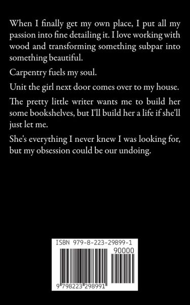When I finally get my own place, I put all my passion into fine detailing it. I love working with wood and transforming something subpar into something beautiful. Carpentry fuels my soul. Unit the girl next door comes over to my house. The pretty little writer wants me to build her some bookshelves, but I'll build her a life if she'll just let me. She's everything I never knew I was looking for, but my obsession could be our undoing.