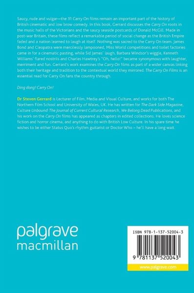 Saucy, rude and vulgar-the 31 Carry On films remain an important part of the history of British cinematic and low brow comedy. In this book, Gerrard discusses the Carry On roots in the music halls of the Victorians and the saucy seaside postcards of Donald McGill. Made in post-war Britain, these films reflect a remarkable period of social change as the British Empire faded and a nation learned to laugh at itself. Nothing was sacred to the Carry On team. James Bond and Cleopatra were mercilessly lampooned, Miss World competitions and toilet factories came in for a cinematic pasting, while Sid James' laugh, Barbara Windsor's wiggle, Kenneth Williams' flared nostrils and Charles Hawtrey's "Oh, hello!" became synonymous with laughter, merriment and fun. Gerrard's work examines the Carry On films as part of a wider canvas linking both their heritage and tradition to the contextual world they mirrored. The Carry On Films is an essential read for Carry On fans the country through.