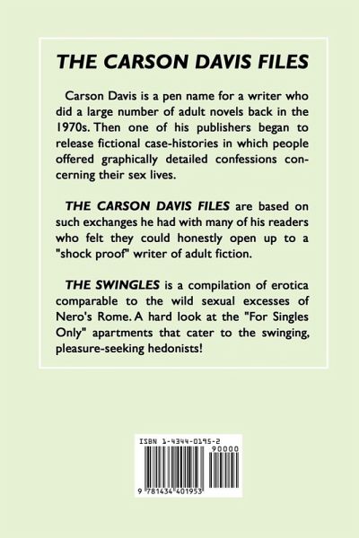 Carson Davis is a pen name for a writer who did a large number of adult novels back in the 1970s. Then one of his publishers began to release fictional case-histories in which people offered graphically detailed confessions concerning their sex lives. THE CARSON DAVIS FILES are based on such exchanges he had with many of his readers who felt they could honestly open up to a "shock proof" writer of adult fiction. THE SWINGLES is a compilation of erotica comparable to the wild sexual excesses of Nero's Rome. A hard look at the "For Singles Only" apartments that cater to the swinging, pleasure-seeking hedonists!