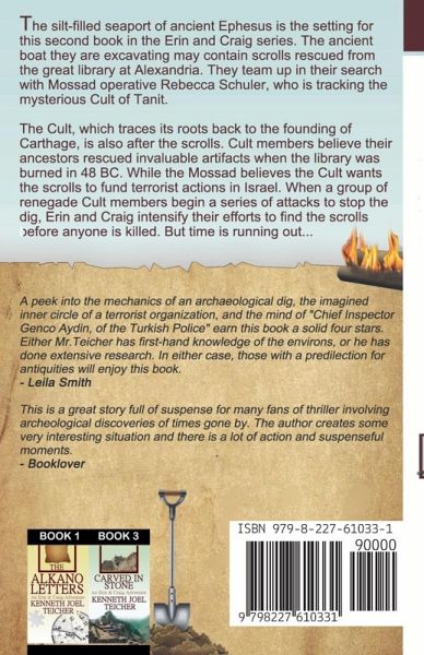 After two unsuccessful digs, one in Israel and one in Tunisia, archaeologist Erin Mathews is facing the loss of funding for future digs and the dreadful prospect of going back to teaching. Her current excavation, in the silt-filled seaport of ancient Ephesus, is also turning out to be a bust. The arrival of her boyfriend Craig Johnson an ex-CIA agent, does little to raise her spirits. But when she learns that a boat she and her team are excavating may contain scrolls rescued from the storied great library at Alexandria, everything changes. Her quest for these historic artifacts becomes the adventure of her life. Mossad operative Rebecca Schuler, sanctioned to work in Turkey, is tracking the mysterious Cult of Tanit. This group, that traces its roots to the founding of Carthage, is also after the scrolls. Cult members believe their ancestors rescued invaluable artifacts when the library was burned in 48 BC. The Mossad believes the Cult wants the scrolls to fund terrorist actions in Israel. A group of renegade Cult members begin a series of attacks to stop Erin. Further complicating her plans, an Egyptian, dispatched by his government's Department of Antiquities, is sent to claim the treasure for his country. Erin's colleague is seen making a deal with this man and is murdered by rogue Cult members. The murder prompts Craig to talk Erin into giving up her dig, but she is determined to make the discovery to rescue her failing reputation. Even with the involvement of the local police, Cult members find ways to thwart Erin's efforts. They break into a storage shed, where discovered relics are stored and there is a malicious nocturnal disruption of the dig site. As upsetting as these events are they do not prevent Erin from continuing her search. The Cult's actions escalate to car chases, blackmail, a ransacking of Erin's hotel room and even armed assaults. In a frenzied attempt to locate the treasure before anyone is hurt, Erin directs her team to dig in the debris field where artifacts from the boat are soon discovered. Certain she is days away from finding the scrolls, Erin enlists the aid of Craig and Rebecca to help with the excavation. Soon sixteen crates, clearly of Egyptian origin, are uncovered. With permission from Turkish authorities, Erin begins the delicate task of opening the first treasure chest. The Cult leader, desperate to take title to the scrolls, appears at the site where he is quickly placed under arrest. While Erin breaks an ancient seal and works through the heavy waterproof lining of the first box, Cult members launch one last vicious attack. The deadly assault is brought to an end by a large team of police, aided by both Craig and Rebecca. At last, with the representative from Egypt, the handcuffed Cult leader, Turkish authorities and of course Erin's graduate students all looking on, the contents of the chests are revealed. Erin's excitement is uncontrollable as she removes one ancient scroll after another. Her wildest dreams have been realized - a fantastic history making discovery of lost knowledge from the ancient world.