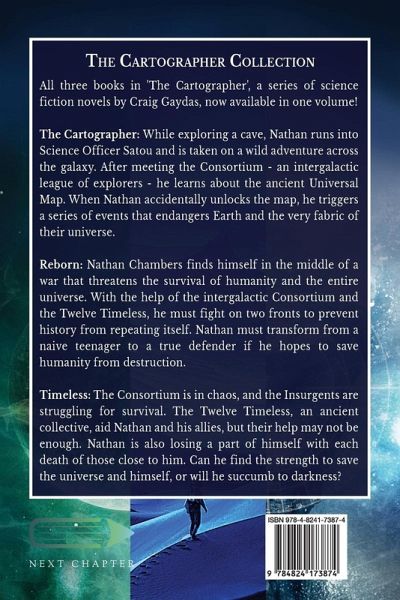 All three books in 'The Cartographer', a series of science fiction novels by Craig Gaydas, now available in one volume! The Cartographer: While exploring a cave, Nathan runs into Science Officer Satou and is taken on a wild adventure across the galaxy. After meeting the Consortium - an intergalactic league of explorers - he learns about the ancient Universal Map. When Nathan accidentally unlocks the map, he triggers a series of events that endangers Earth and the very fabric of their universe. Reborn: Nathan Chambers finds himself in the middle of a war that threatens the survival of humanity and the entire universe. With the help of the intergalactic Consortium and the Twelve Timeless, he must fight on two fronts to prevent history from repeating itself. Nathan must transform from a naive teenager to a true defender if he hopes to save humanity from destruction. Timeless: The Consortium is in chaos, and the Insurgents are struggling for survival. The Twelve Timeless, an ancient collective, aid Nathan and his allies, but their help may not be enough. Nathan is also losing a part of himself with each death of those close to him. Can he find the strength to save the universe and himself, or will he succumb to darkness?