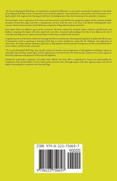 "The Case for Banning Pit-Bull Dogs: A Comprehensive Analysis for Politicians" is a provocative and detailed examination of the debate surrounding pit-bull dogs and the consideration of breed-specific legislation. Aimed primarily at policymakers, this book presents an in-depth analysis of the arguments for banning pit-bull breeds, including statistical data, historical perspectives, and policy evaluations. The book begins with an exploration of the history and characteristics of pit-bull breeds, tracing their origins and the evolution of public perception towards these dogs. It provides a comprehensive overview of the key issues at the heart of the debate, including public safety concerns, behavioral characteristics of pit-bull breeds, and patterns of dog-related incidents and attacks. Each chapter delves into different aspects of the controversy. The book examines the statistical evidence related to pit-bull attacks and fatalities, comparing these figures with other dog breeds to provide a contextual understanding of the risks. It also addresses the role of ownership, breeding practices, and the potential impact of these dogs on public health and safety. A significant portion of the book is dedicated to the legal and ethical considerations of breed-specific legislation. It explores the effectiveness of existing laws aimed at regulating or banning pit-bull dogs in various jurisdictions, along with the challenges and implications of enforcement. The author discusses alternative approaches to dog regulation and the potential consequences of a ban on pit-bull breeds for owners, shelters, and the broader community. "The Case for Banning Pit-Bull Dogs" also critically examines the broader societal implications of such legislation, including its impact on responsible dog ownership, animal rights, and the stigmatization of specific breeds. The book provides a balanced view of the arguments from both proponents and opponents of breed-specific legislation. Intended for policymakers, legislators, and public safety officials, this book offers a comprehensive resource for understanding the complexities of the pit-bull debate. It aims to inform policy decisions with a thorough analysis of the data, legal precedents, and societal impacts surrounding the contentious issue of pit-bull dogs.