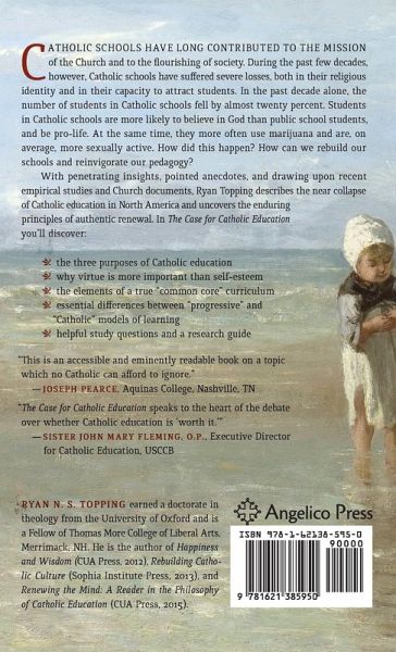 Catholic schools have long contributed to the mission of the Church and to the flourishing of society. During the past few decades, however, Catholic schools have suffered severe losses, both in their religious identity and in their capacity to attract students. With penetrating insights, pointed anecdotes, and drawing upon recent empirical studies and Church documents, Ryan Topping describes the near collapse of Catholic education in North America and uncovers the enduring principles of authentic renewal. In The Case for Catholic Education you'll discover: - the three purposes of Catholic education - why virtue is more important than self-esteem - the elements of a true "common core" curriculum - essential differences between "progressive" and "Catholic" models of learning - helpful study questions and a research guide "This is an accessible and eminently readable book on a topic which no Catholic can afford to ignore."--Joseph Pearce, Aquinas College, Nashville, TN "The Case for Catholic Education speaks to the heart of the debate over whether Catholic education is 'worth it.'"--Sister John Mary Fleming, O.P., Executive Director for Catholic Education, USCCB "The Case for Catholic Education will surely play a vital role in reinvigorating the handing-on of essential Catholic truths."--Sister Joseph Andrew Bogdanowicz, O.P., Dominican Sisters of Mary, Mother of the Eucharist, Ann Arbor, MI "This short book contains an astonishing wealth of insights and practical suggestions."--Dr. Keith Cassidy, President of Our Lady Seat of Wisdom Academy, Barry's Bay, ON, Canada "Ryan Topping has written an engaging and coherent analysis of the state of Catholic education in North America, which will be useful for teachers in Britain, too."--Dr. Paul Shrimpton, Magdalen College School, Oxford, UK "An insightful view of our threatened patrimony and a framed vision for what educating and forming our children may still yet become."--Dr. Jason Fugikawa, Dean of Academics and Faculty, Holy Family Academy, Manchester, NH "The Case for Catholic Education includes sound advice in regards to the teaching of Good Books and then Great Books in the high school years, and for including Christ throughout an education."--Patrick S.J. Carmack, Founder of the Angelicum Academy and the Great Books Academy homeschool programs "It is impossible to read this book without feeling stirred to the joy--and the work--of better educating our young people."--Patrick Conley, Director of Faith Formation, Cathedral of St. Paul, MN "In his latest offering, Ryan Topping presents a lucid and lively exploration of the foundations of a true Catholic education."--Veronica Burchard, Vice President for Education Programs, Sophia Institute for Teachers, Bedford, NH "Every Catholic educator and school administer should read and re-read this fine book."--Dr. Jason West, President and Academic Dean, Newman Theological College, Edmonton, AB, Canada "This engaging book combines incisive appraisal and exposition with inspiring encouragement and exhortation."--Fr. Cajetan Cuddy, O.P., Dominican Province of St. Joseph, New York, NY Ryan N. S. Topping earned a doctorate in theology from the University of Oxford and is a Fellow of Thomas More College of Liberal Arts, Merrimack, NH. He is the author of Happiness and Wisdom (CUA Press, 2012), Rebuilding Catholic Culture (Sophia Institute Press, 2013), and Renewing the Mind: A Reader in the Philosophy of Catholic Education (CUA Press, 2015).